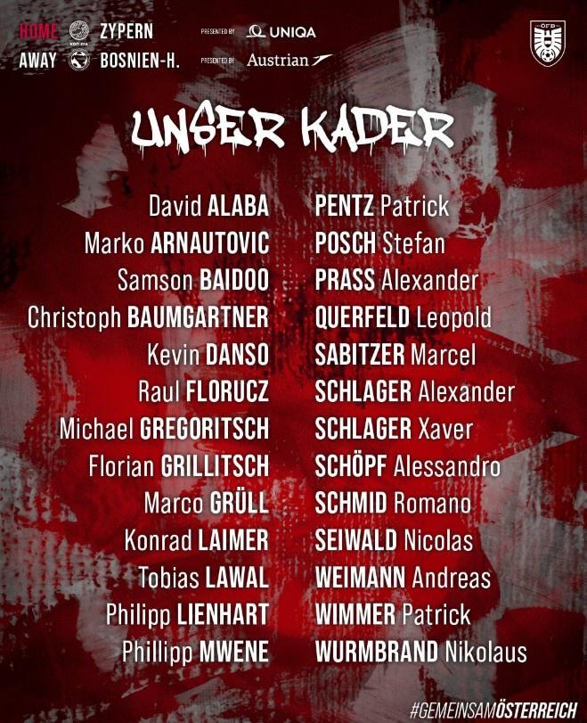 直播吧8月26日讯 为了迎接即将到来的对阵塞浦路斯和波黑的世预赛,奥地利国家队公布了新一期的大名单,阿拉巴领衔,萨比策、莱默尔、阿瑙托维奇入选。